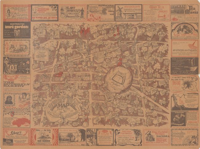 This two-sided pictorial map of Beverly Hills was created by Dirk Wunderlich and issued in the 62-page Beverly Hills Official Farmers Almanack: A Compilation of Fashionable Merchants Serving the Beautiful People. The map shows the city’s street-grid pattern and is filled with quirky characters and signs promoting local businesses. Advertisements surround both maps including Hollywood Sports Cars, Inc., Imre Gordon Electrolysis, and Benihana to name a few. Decorated by classic strapwork title cartouches with psychedelic lettering.