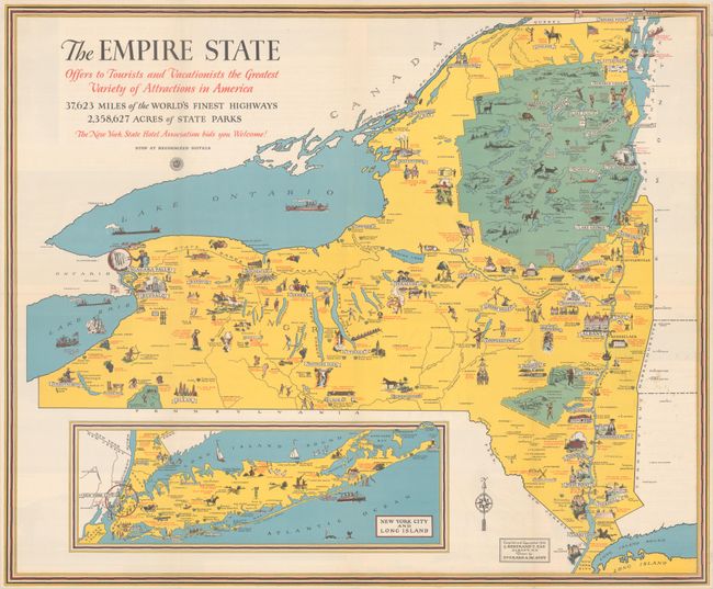 An attractive pictorial map of the state drawn by Everard McAvoy and published by Bertrand Fay on behalf of the New York State Hotel Association. Intended for the tourist, It is filled with illustrations presenting the state's history, points of interest, and natural features. State parks are shaded in green including the Adirondacks, Catskills, and Allegany State Park. Features an inset at bottom showing all of Long Island. On verso are related text and illustrations with a reminder to "Stop at Recognized Hotels." Self-folding.