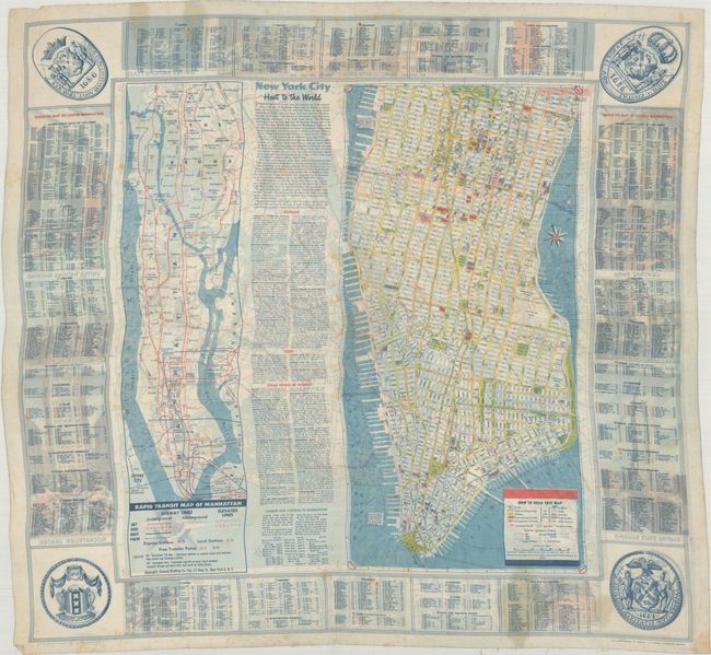This unusual cloth map was designed by the General Drafting Company and sponsored by the Esso Oil Company. One side contains a large map of the greater New York region (24.4 x 23.3”) showing the road network and is surrounded by large illustrations of several landmarks including the Empire State Building, Rockefeller Center, and the U.N. building. The other side contains additional maps of Lower Manhattan and the rapid transit system, some text, and an index to streets and points of interest. The printing was accomplished via the “Glo-vure Process. Pat pending. A. Langseth-Christensen creation.” The resulting product is very soft and silk-like and was likely intended as a scarf. We found three other examples on OCLC were it was also described as “possibly intended to be worn as a scarf.”
