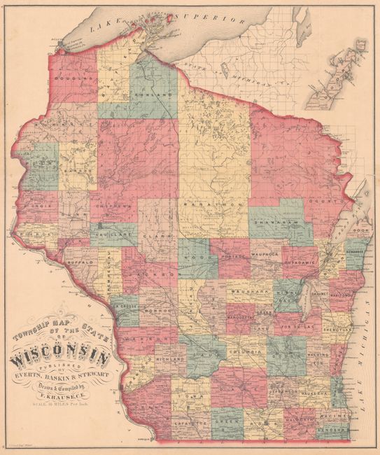 This scarce map was compiled and drawn by Frank Krause and published in an atlas for Walworth County, Wisconsin. It is delineated by county and township and locates towns and villages, railroads, rivers, lakes and more. Above the map are population tables for the state revealing that the population surged from approximately 31,000 in 1840 to over 1 million residents by 1870. Despite this growth, the northeast portion of the state above Green Bay is still void of settlement.