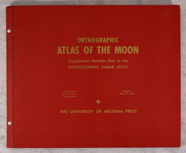 The Lunar Atlas was commissioned by the United States Air Force "to provide the most complete and best available photographic coverage of the moon as a contribution of the United States Government in the national space effort." The photographs were an invaluable tool that assisted in planning spacecraft missions to the moon, and in particular helped determine operational sites for the 1969 moon landing. The atlas was accompanied by two supplements: Orthographic Atlas of the Moon and Rectified Lunar Atlas. This lot consists of the first supplement, which includes 64 full-page photographic plates and two pages of text explaining the construction of the atlas. The plates carry the "standard cartographic map grid at intervals of 0.01 of the lunar radius" and are overlaid with accurate lunar co-ordinates. The plates are single sheets that are bound with two posts between red-cloth covered boards with gilt title on front cover. The work was compiled by D. W. G. Arthur and A. E. Whitaker, edited by Gerard P. Kuiper, and published by the University of Arizona Press. Oblong elephant folio.