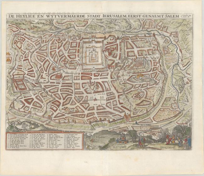 This detailed bird's-eye plan was one of the most popular plans of Jerusalem during the seventeenth century. While it is imaginary, it provides great detail of the city walls and streets, with 36 principal sites numbered and keyed to a table in a cartouche at bottom left. Solomon's Temple is at upper center and Herod's Palace is located at the far left. Biblical scenes are shown on the hillsides in the foreground. The elder's mark (an old fisherman) can be seen at top left of the map key. Dutch text on verso.