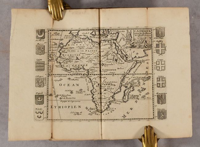 This charming miniature atlas contains 35 folding maps of the world, the 5 continents, regions around Europe, and a military-themed engraving. Daniel de la Feuille published the first edition of his Tablettes Guerrieres in Dutch and French text in 1706, with subsequent editions in 1707 and 1708 until his death in 1709, after which point his son, Paul, continued publishing the atlas through 1726. Nearly all of the maps, with the exception of the world map and several continent maps, are surrounded by armorial shields, city views, or city plans, adding a pleasant decorative element. The most important maps, of course, are those of the world and continents: