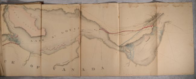 This Canadian government report concerns the practicality of establishing a canal between Lake Champlain and the St. Lawrence River as well as improving ship navigation within the river itself. The purpose of the work was "to furnish a cheaper, quicker, and a more desirable route to the great trade which passes between the tide water in the Hudson River, the Railways in New England and the City of New York, on the one hand, and the Western States and Canada." The report is augmented by 6 maps of the river on 5 folding sheets including the incredibly long (20 x 200") Plan of the River St. Lawrence between Prescott and Montreal by George Matthews. This long map shows the "steam boat track" through the river, adjoining canals, navigational hazards, rapids, islands, and more. The volume contains 40 pages of reports, estimates, statements and letters regarding the St. Lawrence River and proposed canal. The long map is curiously omitted from the table of contents. Rebacked with original brown cloth boards.