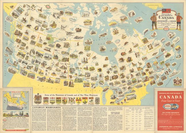This pictorial map of Canada was issued by Imperial Oil Limited. It shows the Canadian landscape filled with small illustrations depicting the culture, history, landmarks, and wildlife of the country. Among the assorted sights to be seen are the Niagara Falls, salmon fishing, maple syrup, moose, Royal Canadian Mounted Police headquarters, Henry Hudson, black bears, caribou, various parliament buildings, Hudson's Bay Company posts, national parks, and city views. The arms of Canada and her nine provinces appear along the bottom of the map. The title cartouche features a lumberjack, a Mountie, and the flag. Text below the map offers information about population, history, cities, and more, and a table presents facts about the provinces and territories. On verso is another map, Dominion of Canada with Newfoundland & Labrador Featuring Land, Water, and Air Transportation (28.5 x 20.4"), which delineates various transportation routes and includes additional information on Canadian aviation and the Trans-Canada Highway. Self-folds into a pamphlet titled "Imperial Oil Map Number 1 Canada from Coast to Coast." This example was offered by Melville Travel Service in Toronto, whose inked stamp appears in Greenland.