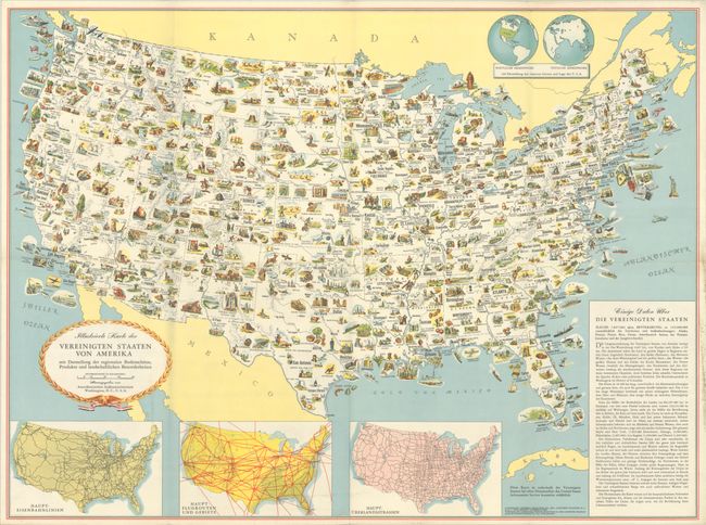 This pictorial map was created by General Drafting Co. and was published in numerous editions in different languages around the 1950s, possibly to counteract propaganda created by the Soviet Union during the Cold War era. This German-language edition is packed with information and features hundreds of drawings in full color including points of interest, natural resources, and agricultural products. At bottom are inset maps showing railroad lines, air routes, and highways. At top is a double-hemisphere map of the world showing the location of the United States. Published by the U.S. Department of State in Washington, D.C.