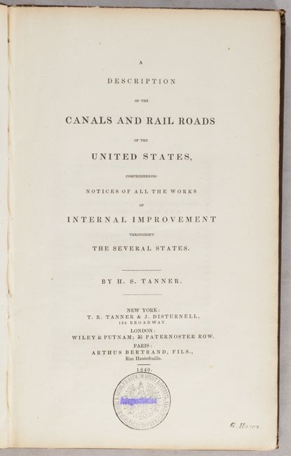 The volume includes two additional plates showing profiles of various canals and a 4-page advertisement listing other works available for sale by Tanner & Disturnell. 272 pp. Hardbound in brown cloth with gilt embossing on front cover and gilt title on spine.