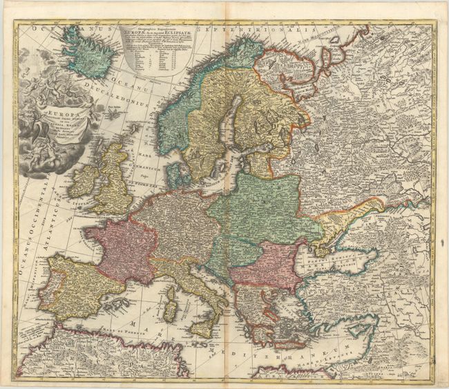 An attractive early 18th century map by this important German cartographer. The map illustrates the Christian kingdoms in Europe and is characteristically filled with details, even for such a general map. The large title cartouche features a personification of Europa surrounded by adorable putti nestled in the clouds.