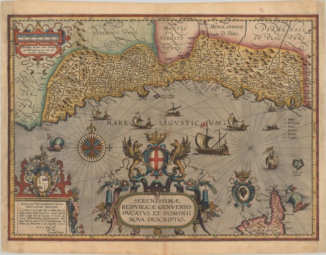This map was among the additions made by Jan Baptista Vrients when he took over publication of the Theatrum after Ortelius' death. It was published only in the last four editions and is therefore quite scarce, with an estimated 925 examples printed according to Van den Broecke. Vrients based this map in part on the work of Giovanni Antonio Magini, who published a map of east Liguria and a map of west Liguria in 1597. Vrients' map was the first to focus on the entire region of Liguria, and subsequently became the model for all Dutch cartographers of the 17th century. The map shows the coastline from Nice, France and Monaco in the west to La Spezia and Massa in the east. Keeping with Vrients' ornate style, the map is lavishly decorated with cartouches, sailing ships, sea monsters, and a compass rose. The cartouche at bottom left dedicates the map to Sig.r Antonioto Sivori, a Genoese gentleman. Spanish text on verso, published in 1609, 1612 or 1641.