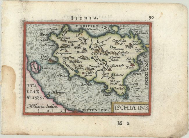 Charming miniature map of this Italian island famous for its therapeutic baths. The map is oriented with north to the bottom, and towns are depicted as tiny castles. French text on verso.