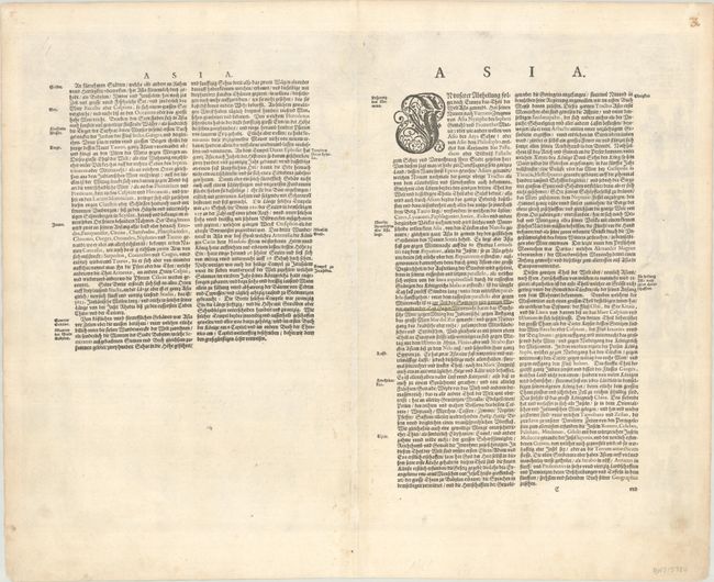 This is one of the most famous 17th century maps of the continent of Asia. It is surrounded by a beautiful carte-a-figures border and is richly ornamented with animals, sea monsters, and sailing ships. The eastern coastline of Asia is severely truncated, Korea is shown as an island, and Japan is depicted on the Ortelius-Teixeira model. The Indian subcontinent is too narrow and the islands of Indonesia are very sketchy. A large island labeled Ceiram probably represents the western part of New Guinea. In the interior, the Caspian Sea is oriented on an east-west axis and there are several large erroneous lakes in China including the mythical Chiamay Lacus. The frieze across the top features vignettes of the cities of Candy, Calecut, Goa, Damascus, Jerusalem, Hormuz, Banten, Aden, and Macao. The inclusion of Banten reflects the emergence of the Dutch as a major commercial power in the East Indies. The side panels flanking the map depict costumed figures of the various Asian peoples. This is an early edition prior to the appearance of a crack in the copperplate at bottom center. German text on verso, published between 1634-35.