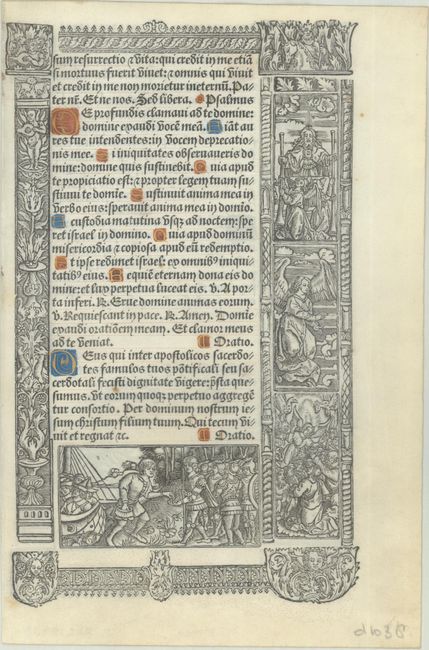 Unusual vellum leaf printed in Gothic textura type with illuminated capitals in red, blue and burnished gold leaf. The text is surrounded by elaborate iron engravings that include plants and animals, as well as cherubs and a unicorn. Printed vellum Book of Hours leaves are very scarce, as they were only produced between 1496 and 1530. The text includes Psalm 129, which translates as: