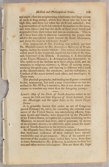 This 23-page disbound section of text from the The Medical Repository, and Review of American Publications…for November and December, 1805, and January, 1806> includes an important 4-page article entitled “Lewis’s Map of the Parts of North-America which lie between the 25th and 51st Degrees of North Latitude, from the Missisippi [sic] and the upper Lakes to the North Pacific Ocean” (pages 315-318). Mitchill was a physician, U.S. Congressman and Senator, founding editor of this first medical journal (Medical Repository) in the U.S., and an active correspondent of Thomas Jefferson who called him the “Congressional Dictionary.” Mitchill had a strong interest in maps and western exploration. As Jefferson’s friend and supporter in Congress, he apparently had access to the early reports sent to Jefferson by Lewis and Clark, and he published much of the information in this magazine. In this article, Mitchill describes in some detail the manuscript map by Lewis (likely Wheat Transmississippi West #270) forwarded to the War Department from which “other copies have been made for the inspection of Congress.” He notes that “Nicolas King, the draftsman, has performed his part with great elegance, on a scale of 50 miles to the inch. The map will not be engraved and offered for general use before the voyagers return from their expedition.” Mitchill then presents additional information “from the documents collected by Capt. Lewis” apparently before publication in Jefferson’s Report to Congress on February 19, 1806. Mitchell’s article confirms that there were multiple updated manuscript copies drafted by King in circulation in Washington at the end of 1805. In addition, Mitchill included a summary of the Dunbar/Hunter expedition and translations of French explorations by Soulard and Trudeau (pages 305-315).
