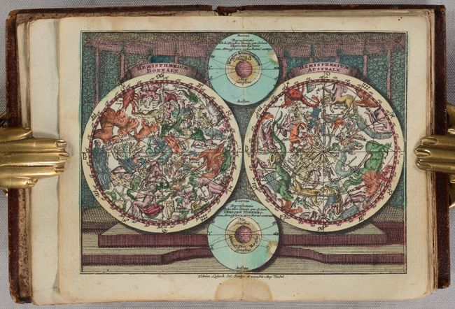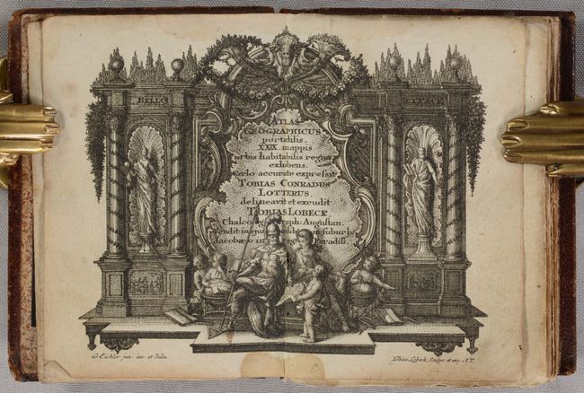 Fine pocket atlas with decorative maps in full contemporary color. It opens with a title page in an architectural cartouche, followed by an allegorical frontispiece, both drawn by Gottfried Eichler, junior. The maps include the celestial and terrestrial hemispheres, the continents, and detailed maps of western and eastern Europe. Most maps are embellished with a fine title cartouche. This atlas was a collaborative publication between Tobias Conrad Lotter and Tobias Lobeck, first published in 1747 with an almanac. The atlas remained in use for many years, with the maps reprinted and with new maps added, but the title page continued to report 29 maps. The maps present are: