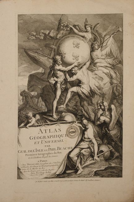 Dezauche's mammoth atlas volume of the world is based largely upon earlier maps first issued by Guillaume Delisle and thereafter by Philip Buache. When Buache's died, his nephew acquired the plates and Dezauche purchased them in 1780. He first published this atlas shortly thereafter in 1781. The present example contains a total of 91 maps, including 89 that are double-page. While there is no list of maps in the volume, manuscript numbering found on verso range from #1-98, with 7 maps of Europe that appear to be missing (manuscript #8, 22, 31, 32 and 34-37). The other regions of the world are complete, with maps broken out as follows: World (5), Europe (63 of 70), Asia (9), Africa (5), and Americas (9). While the title page is dated 1781, both the world and western hemisphere maps are dated 1785 indicating a later publication date. Maps of particular interest in this atlas include: