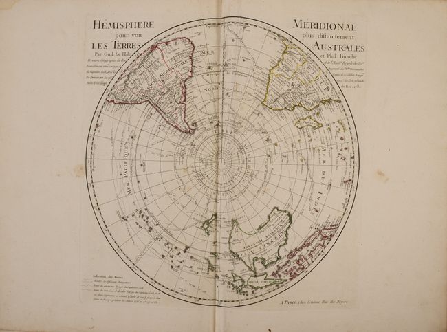 Mappemonde a l'Usage du Roi…, dated 1785 (25.5 x 17.8"). An impressive, large double hemisphere presented in Delisle's crisp, elegant style. The advertisement cartouche mentions the recent discoveries and voyages of Captain Cook, whose exploration routes and dates are noted on the map. The Pacific Northwest and the coasts of Australia and New Zealand are updated with information from his expeditions. There is a note in the newly discovered O-Why-Hee (Hawaii) noting the date that Capt. Cook perished in 1779. The title cartouche is centered on the French royal coat of arms.