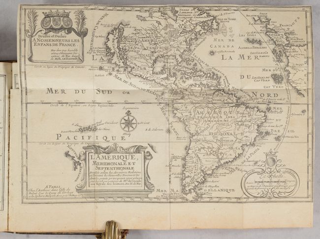 B. L'Amerique, Meridionale et Septentrionale… Featuring the island of California covering the entire west coast north of the Tropic of Cancer with two large imaginary islands offshore. One of the prominent features in northern Mexico is Les Mine de S. Iean et de Ste. Barbe, the legendary Santa Barbara mines of the Chihuahua-Durango region. There are several large spurious lakes on both continents. A partial coastline of New Zealand appears beside the title cartouche. The map is richly decorated with three cartouches and a compass rose. This is the first state. References: Burden #759; McLaughlin #135.