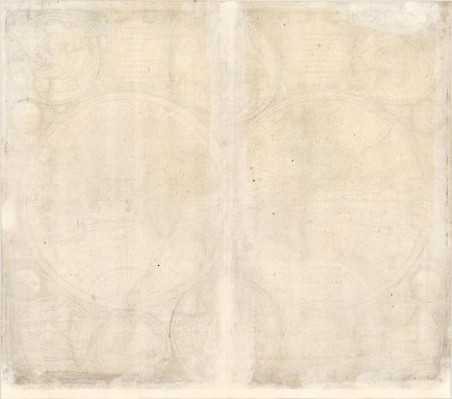 This is one of the most graphic 18th century world maps. The bold engraving style follows Carel Allard's map of 1696 with the central twin hemisphere map surrounded by several smaller maps on various projections. The island of California is depicted five times on the sheet. In Asia, Japan is shown in a bizarre shape that incorporates a huge Terra Yedso (Hokkaido). The coastlines of Australia and New Zealand are beginning to take shape, and New Guinea is shown twice - once in each hemisphere. The map is filled with detail including the tracks of several explorers. A richly engraved background of clouds with numerous wind heads, lesser spheres and two cartouches complete the stunning composition.
