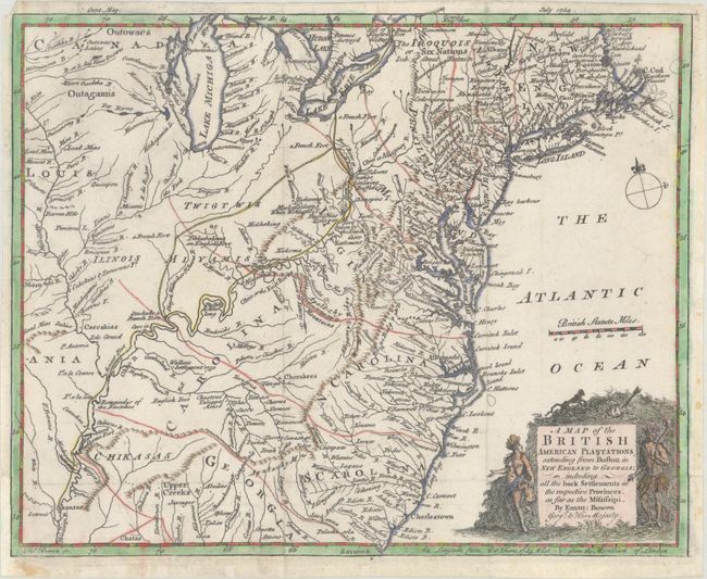 This splendid map with unusual colonial borders covers the area east of the Mississippi River, from Niagara Falls to Port Royal, SC. It presents major towns and cities, Indian villages and tribal territory, English and French forts, boundaries, trails and topography. According to Cumming, this map has the most complete delineation of Indian tribes, especially west of the Blue Ridge Mountains, in a printed map up to this time.