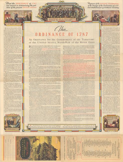 This fascinating map was issued at the 150th anniversary of the signing of the Northwest Ordinance of 1787 and was published by The Northwest Territory Celebration Commission. The sheet features inset maps at bottom depicting how each state was formed, with insets at top showing the various Indian treaties that allowed settlement to extend west. The main map image is filled with historical notations and illustrations, and is decorated by a large compass rose. The verso contains the full text of the 1787 ordinance.