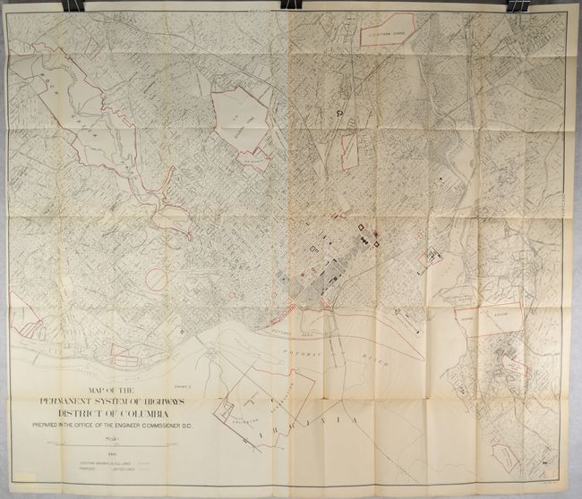 This mammoth map was issued on two sheets and joined together. It presents the street-grid pattern of the city in fine detail with many important buildings identified including the Washington Monument, Smithsonian, Executive Mansion, Capitol, Naval Observatory, and many more. The map extends across the Potomac River to include Rosslyn, Arlington and the National Cemetery, and also names several new subdivisions including Chevy Chase, Woodley Park and Cleveland Park. A legend at bottom left further identifies existing and proposed highways. Lithographed by Julius Bien in New York.