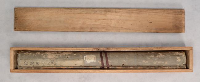 There is minor foxing, some extraneous creasing, and numerous wormholes throughout that have been repaired on verso with tissue. Wooden box is sturdy with some minor soiling.