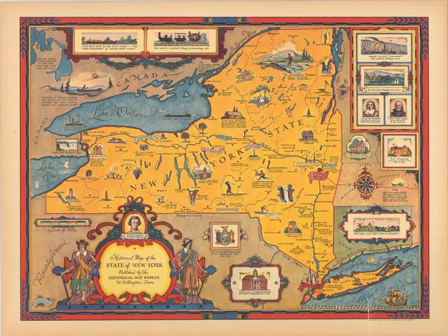 This historical map of the state was designed by George Annand and published by the Historical Map Bureau in West Willington, Connecticut. It is filled with illustrations showing historical landmarks, points of interest, and natural features with additional vignettes along the borders featuring West Point, New York City, Federal Hall and more. Further embellished by a decorative border, elaborate 16-point compass rose with fleur-de-lis, and strapwork title cartouche.