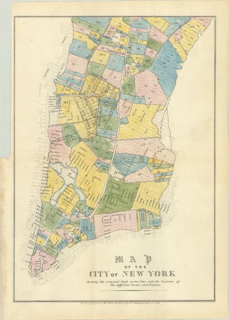 This is an interesting small map of New York City, which is drawn to show the high water line, demonstrating those areas that are prone to flooding. The map is also color coded to show city wards and locates important streets.
