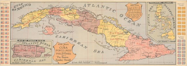 B. War Maps of Cuba Porto Rico and the Philippines. Issued by the Boston Herald (25.3 x 9.7"). A detailed map of Cuba with insets of Puerto Rico and the Philippines. Flags of the U.S., Spain and Cuba flank the maps and could be cut out and pinned on cities "as they are held or captured by the respective armies." Issued as a supplement to the May 8, 1898 issue.