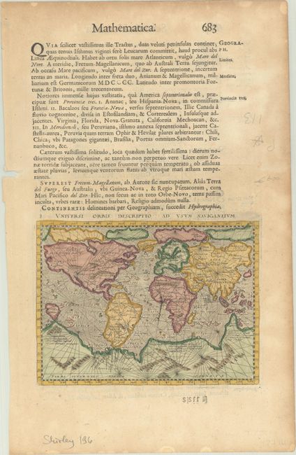 This small mariner's map is based on one of the most important world maps of the 16th century: Gerard Mercator's multi-sheet map of 1569. The map reflects the belief in wide Arctic sea passages and depicts a huge southern continent, to which Magini has added fanciful ranges of mountains. A fine network of rhumb lines crisscross the map, and the oceans are stipple engraved in the Italian style. Printed on a full sheet of Latin text (8.6 x 13.6"), with the text below the map providing navigational instructions. The map was engraved by Girolamo Porro and first published in an edition of Ptolemy's Geography that was edited by the distinguished Italian geographer Giovanni Magini. This example comes from Léon de Saint-Jean's Studium Sapientiae Universalis. Contextus Scientiae-Humanae.