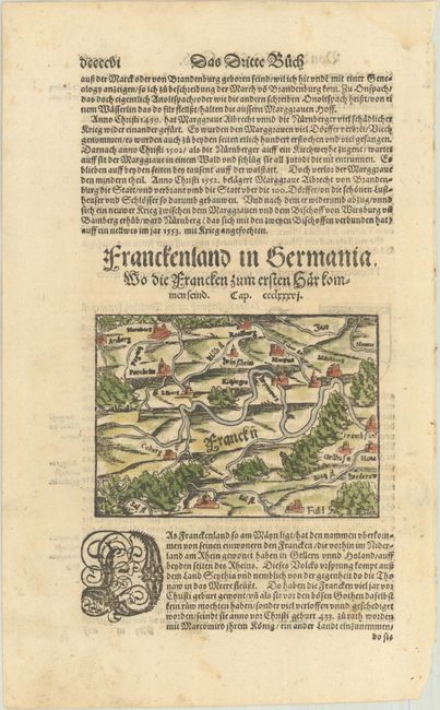 This woodblock map is oriented with north to the bottom of the map, and shows the region between Frankfurt, Fulda and Nuremberg. On a sheet of German text measuring 8.0 x 13.1".