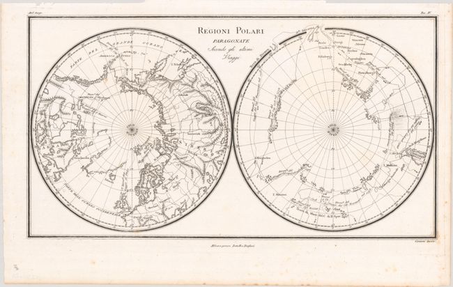 B. Regioni Polari Paragonate Secondo gli Ultimi Viaggi, by Luigi Rossi, from Nuovo Atlante di Geografia Universale..., published 1820, black & white (15.5 x 8.5"). This uncommon Italian map depicts the north and south poles in two hemispheres on one sheet. Only the continental outlines are delineated, shown with basic topography and a few place names. The routes of MacKenzie and Hearn are identified in North America, while Captain Cook’s tracks are prominently shown around the South Pole. Published by by Batelli & Fanfani. Engraved by Caniani. Reference: Phillips (A) #739-4. Condition: A dark impression on a bright sheet with minor foxing that is mostly confined to the margins.