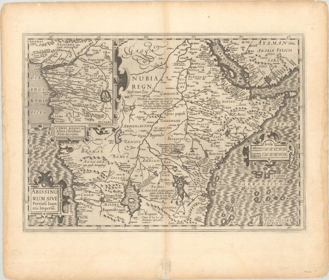 The legendary kingdom of the Christian Prester John is the central focus of this impressive map of central Africa. It is cartographically similar to Ortelius' map, based on the travels of the Portuguese explorer Francisco Alveres, who searched for the mythical kingdom in 1520. The kingdom itself is shown atop the Amara Mons in the region that Alveres encountered the Coptic Christian ruler David II. The large inset of the Congo region, also based on Ortelius, illustrates the travels of another Portuguese explorer, Duarte Lopez. The Nile is shown with its source in the Ptolemaic twin lakes of Zaire and Zaflan, at the foot of the Mountains of the Moon (Lunae Montes). The stunning sheet is graced with strapwork title and scale of miles cartouches and a bold moire patterned sea. Latin text on verso.
