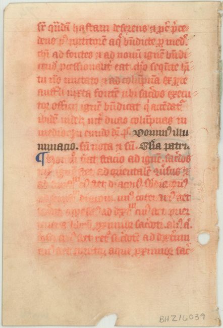 This vellum leaf is unique in that the text is written almost entirely in red ink. There is one large initial in blue with red pen work in the margin on recto.