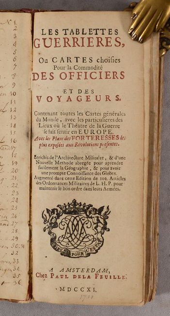 This charming miniature atlas contains 35 folding maps of the world, the 5 continents, regions around Europe, and a military-themed engraving. Daniel de la Feuille published the first edition of his Tablettes Guerrieres in Dutch and French text in 1706, with subsequent editions in 1707 and 1708 until his death in 1709, after which point his son, Paul, continued publishing the atlas through 1726. Nearly all of the maps, with the exception of the world map and several continent maps, are surrounded by armorial shields, city views, or city plans, adding a pleasant decorative element. The most important maps, of course, are those of the world and continents: