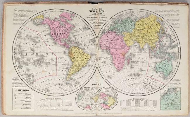 This revised and enlarged edition contains 35 maps, consisting of 3 double-page and 21 single-page maps. Of particular interest is the double-page map of the United States with early territorial borders in the west. The territories of Washington and Oregon extend to the Continental Divide, Utah is a huge area that extends from California to the Continental Divide. New Mexico Territory occupies all of today's Arizona and part of Colorado and the border with Mexico reflects the Gadsden Purchase. A huge Nebraska extends between the Continental Divide and Minnesota. A large Gold Region is shown in north central California. The atlas also contains several regional maps of the United States including one of the Far West, a single-page map of Texas, and double-page map of the world. Includes 13 pages of statistical tables. Quarter leather over brown-colored pictorial boards. 68 pages. Published by Daniel Burgess & Co.