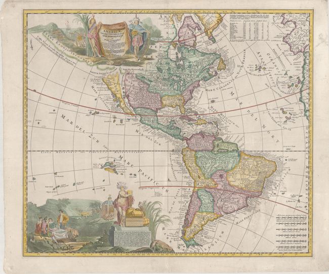 This uncommon map of the Americas, engraved by A.F. Zurner, is based largely on the cartography of Visscher and Sanson. California is shown as an island with an indented northern coast on the Sanson model with the inclusion of three place names in Southern California: S. Isidoro, Gigante and N S del la Guadalupe. In South America, the mythical lakes Parima Lac and Xarayes still appear. The map is embellished with two superb pictorial cartouches. The title cartouche, flanked by two Native Americans, conveniently hides Terra Esonis Incognita that stretches out towards Asia and the Fretum Anian that separates it from California. Latin text enclosed in the cartouche discusses the explorations of Columbus and Vesputius, and the Catholic missions. The large vignette at bottom shows explorers seated around a table, natives worshiping in a temple, a battle, and the allegorical figure of America displaying the wealth of the hemisphere.