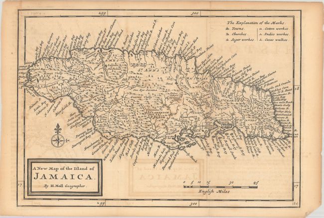A detailed map of the island locating scores of towns and coastal place names, roads, mountains and forests. The island is divided into the English system of parishes and a legend at top right identifies factories for sugar, cotton, indigo and cocoa. Decorated by a simple block-style title cartouche.