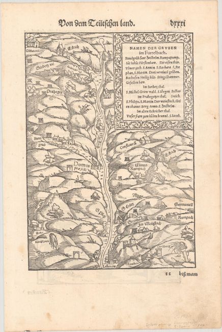 This fascinating and early woodblock view names the mines in Alsace along the La Liepvrette River. Oriented with north to the right, the map shows the city of Liepvre and the Chateau du Haut-Koenigsbourg at bottom, with other small towns such as Minus Rumpach (Petit Rombach) further west. This is one of the first maps to show the location of mines. The view shows simplified topography with villages, castles, and even a gallows noted. German text on verso, along with a small engraving of metalworkers hammering away at their task. The lot includes a bifolium with 4 pages showing 6 additional vignettes of silver mining and smelting.