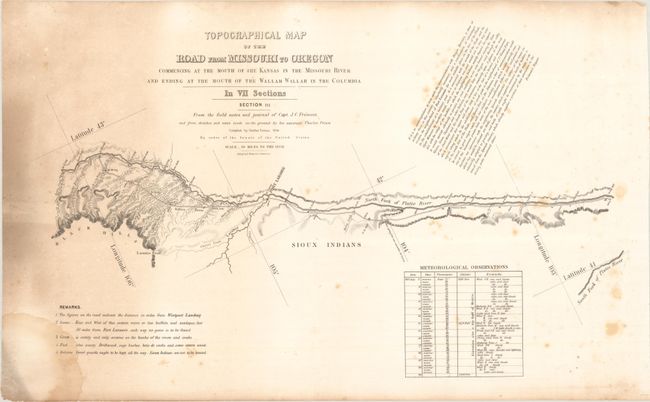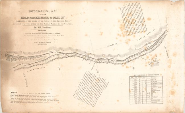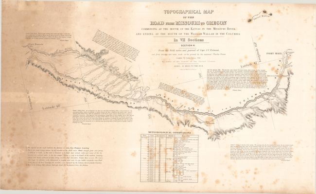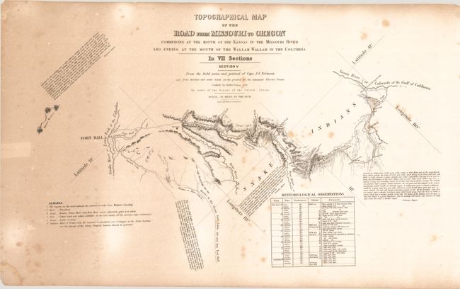 The five contiguous sheets offered here cover the route from Grand Island on the Platte River to Fort Boise at the confluence of the Snake and Boise rivers. Each sheet contains fascinating comments from Fremont's narrative, and notes regarding water, grass, fuel, game and Indians; invaluable information for emigrants at the time. This is the original Senate version that includes the attribution to E. Weber & Co. directly below the titles.