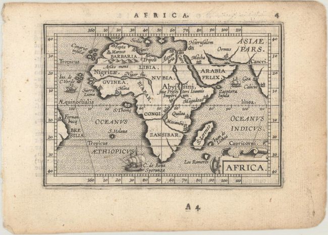 C. Africa. This handsome miniature map of Africa is lacking a great deal of detail but is interesting for its strange depiction of the Nile, which originates in a large lake south of the Equator. From this lake three large rivers flow to the seas: the Nile to the Mediterranean, the Congo to the Atlantic and what could be the Zambeze to the Indian Ocean. The map is decorated with a strapwork title cartouche and three sailing ships. Reference: Betz #47.