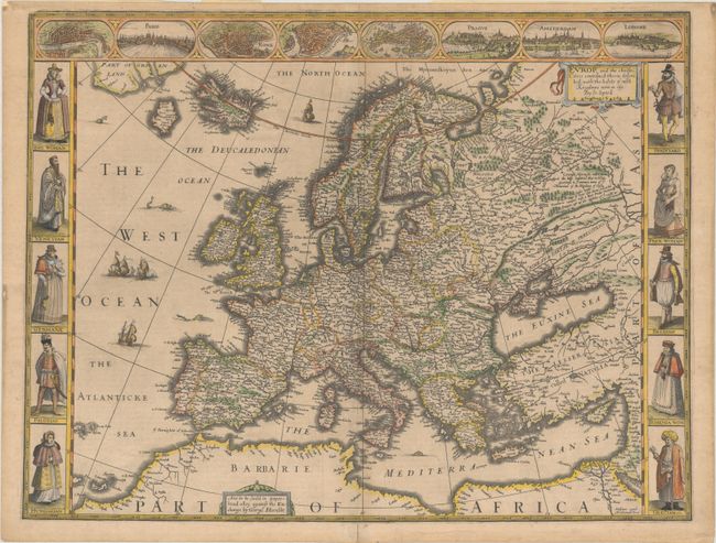 This is one of the most beautiful carte-a-figure maps of Europe, surrounded with vignettes on three sides. The upper frieze has eight bird's-eye views of London, Paris, Rome, Constantinople, Venice, Prague, Amsterdam, and Lisbon. The side borders contain the costumes of the noblemen and women of ten European nations. The map shows the well-detailed but fictitious island of Frisland just off the coast of Iceland, and the seas are alive with sea monsters and ships. Beautifully engraved by Abraham Goos and published by George Humble between 1627-32. Related English text on verso.