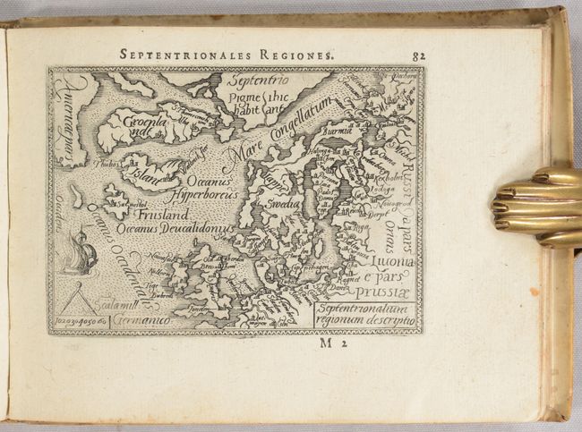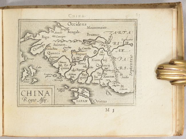 This rare and magnificent miniature atlas was produced by Christoffel Plantin for Filips Galle and includes 94 maps of the world, continents, and various regions around the world. This atlas is from the second series of pocket-atlases published by Galle with maps based on Ortelius' Theatrum Orbis Terrarum. The first pocket-sized atlas, Spieghel der Wereld, also by Galle, was published in 1577, with subsequent editions published in several languages through 1585. The maps were accompanied by text prepared by Peter Heyns, who used the text from the Theatrum. The numbers printed above the maps, adjacent to the letterpress title, corresponded with the number of the map within the Theatrum. This innovative, small atlas was designed to reach the lower middle class, and was a commercial success, prompting numerous reprints and imitations.