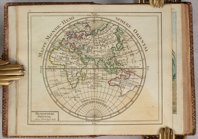 This is a unique example of this handsome miniature atlas with 29 maps and 4 engravings added depicting peoples from around the world. The added engravings show the traditional costumes of both men and women from Congo (Africa), Acadia (Canada), Macau (China) and Anaamoka (French Polynesia). We have not been able to identify the source of these engravings, however, they appear to have been removed from a multi-volume work, as they include a volume number and page number in the top margin. Maps in the atlas include the Eastern Hemisphere, Western Hemisphere, Europe, Asia, Africa, North America, South America, and the regions of Europe. Cartographically, the map of the Eastern Hemisphere shows a large Australian landmass with New Guinea and Tasmania still connected, and the North America map shows a virtually blank northwestern coast and the British colonies are simply labeled Caroline. The frontispiece is lacking in this example, apparently replaced by the engraving of the couple from the Congo. The decorative title page was engraved by L. Legrani. At the end of the volume is a section of text titled Idee de la Sphere, ou Principes sur la Geographie Astronomique, by Rigobert Bonne, dated 1763. The text includes a partial listing of the maps in the volume. 32mo., hardbound in contemporary leather with gilt decorations on covers and spine; marbled endpapers and a.e.g. (all edges gilt). This appears to have been a presentation example as a coat of arms has been embossed in gilt on the covers and also appears on a paper bookplate pasted onto the inside front cover.