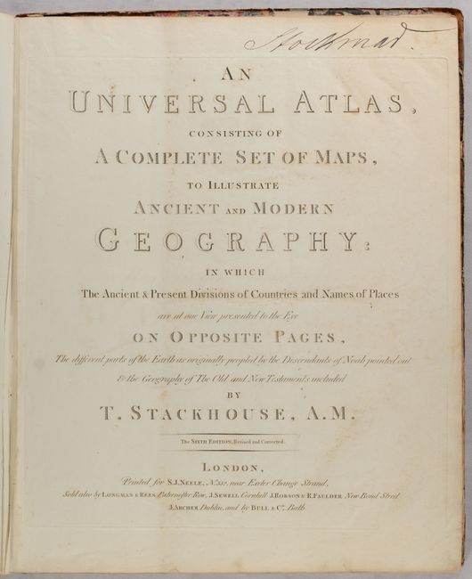 This interesting atlas includes ancient and modern maps presented side-by-side to allow readers to visualize how knowledge of the region, political boundaries, and nomenclature have changed over time. The atlas is complete with 40 maps engraved by Samuel Neele, a title page, a dedication to George, Prince of Wales, a list of subscribers, an index, and an introduction. The ancient maps are credited to the work of Cellarius, Cluver, and D'Anville, and Stackhouse claims that "nothing has been omitted that could render this Atlas of Ancient and Modern Geography much more correct and perfect, than any thing of the sort that went before it." Included are maps of the world, continents, countries in Europe, Turkey, Holy Land, East Indies, and a map of the ancient world showing the "Repeopling of the world by the descendents of Noah." Of particular interest are the following maps: