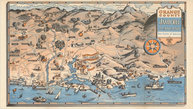 This pictorial map was issued by the Orange County Chamber of Congress in honor of the 1953 Boy Scouts Jamboree held at Irvine Ranch. The Orange County Jamboree was the third ever Jamboree, and the only one ever to be held on the West Coast. This map focuses on sites and activities in the area around the Jamboree, encouraging scouts to explore Orange County. On verso is a listing of activities in various cities and communities in "romantic" Orange County. Lithographed by Lithographic Arts Inc. in Santa Ana, California.