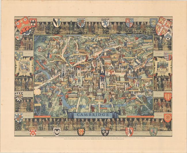 This charming pictorial map of Cambridge is by Kerry Lee and was published by his company Pictorial Maps Ltd. The bird's-eye view of the city centers on the distinctive English Gothic architecture of King's College Chapel. In the foreground, William Makepeace Thackeray, Lord Byron, Geoffrey Chaucer, and other figures survey the scene. Kings, literary legends, and other historical figures fill the map. Streets, buildings of note, and the various colleges are identified. The view is surrounded by an elaborate border incorporating coats of arms, vignettes, and numerous historical figures. Just as you will find illustrations of Georg Hoefnagel within his own compositions for Braun and Hogenberg, artist Kerry Lee appears signing his name beside his dog in the bottom right hand corner of the map. Other maps in this popular series include London, Oxford, Stratford-upon-Avon, Liverpool, and Leeds. Printed in Great Britain by Chromoworks Ltd.
