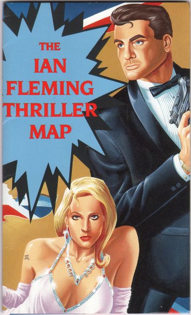 This map is for all aficionados of James Bond and Ian Fleming's series of thriller novels. The focus is of course a larger-than life James Bond, holding a Walther PPK in one hand and a martini with a large centipede in it in the other hand, standing over a Bond girl with a bottle of champagne. The figures bear the likeness of Sean Connery and Ursula Andress, who starred in the first Bond film Dr. No in 1962. Also pictured are an Aston Martin and a "Drax" nuclear missile. The British flag and a world map form the background, with cities that appeared in Fleming's series marked and numbered, corresponding to a legend at bottom listing the locations and routes of James Bond's exploits, which are listed by each novel. The legend is superimposed on the silhouettes of two naked Bond girls. The map is accompanied by the original pictorial cardstock folder in which it was sold. This map was published as a series of literary maps by Aaron Blake Publishers.