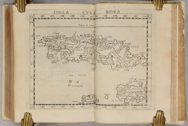Also included is Nueva Hispania Tabula Nova, a foundation map in the cartography of the American Southwest, and a must for collectors of that region. It is an enlarged version of Gastaldi's map of 1548 with the only notable change being the peninsular Yucatan. The legendary seven cities of Ciuola are prominently depicted and Mexico City is shown floating in a large lake. The place names along the upper Gulf Coast reveal the explorations of Pineda, Cabeza de Vaca and Moscosso. The Mississippi makes its appearance as the Rio de Spiritu Santo and the R. Tontonteanc flows in the vicinity of the Colorado River.