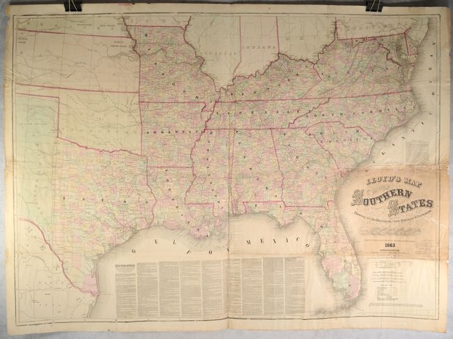 This mammoth Civil War map extends from the Mason-Dixon line south to Florida and west to Missouri and Texas. It is notable for being one of the few versions of the map to show the majority of Texas (most showed just far eastern Texas), with the western portion noted as "Texas Territory." Details include county development, cities and towns, courthouses, forts, completed railroads and projected railroads. The verso contains newspaper-style text describing counties in Virginia and Missouri with title "Lloyd's Military Map and Gazetter of the Southern States." According to Stephenson, Lloyd produced at least 5 editions of this map.